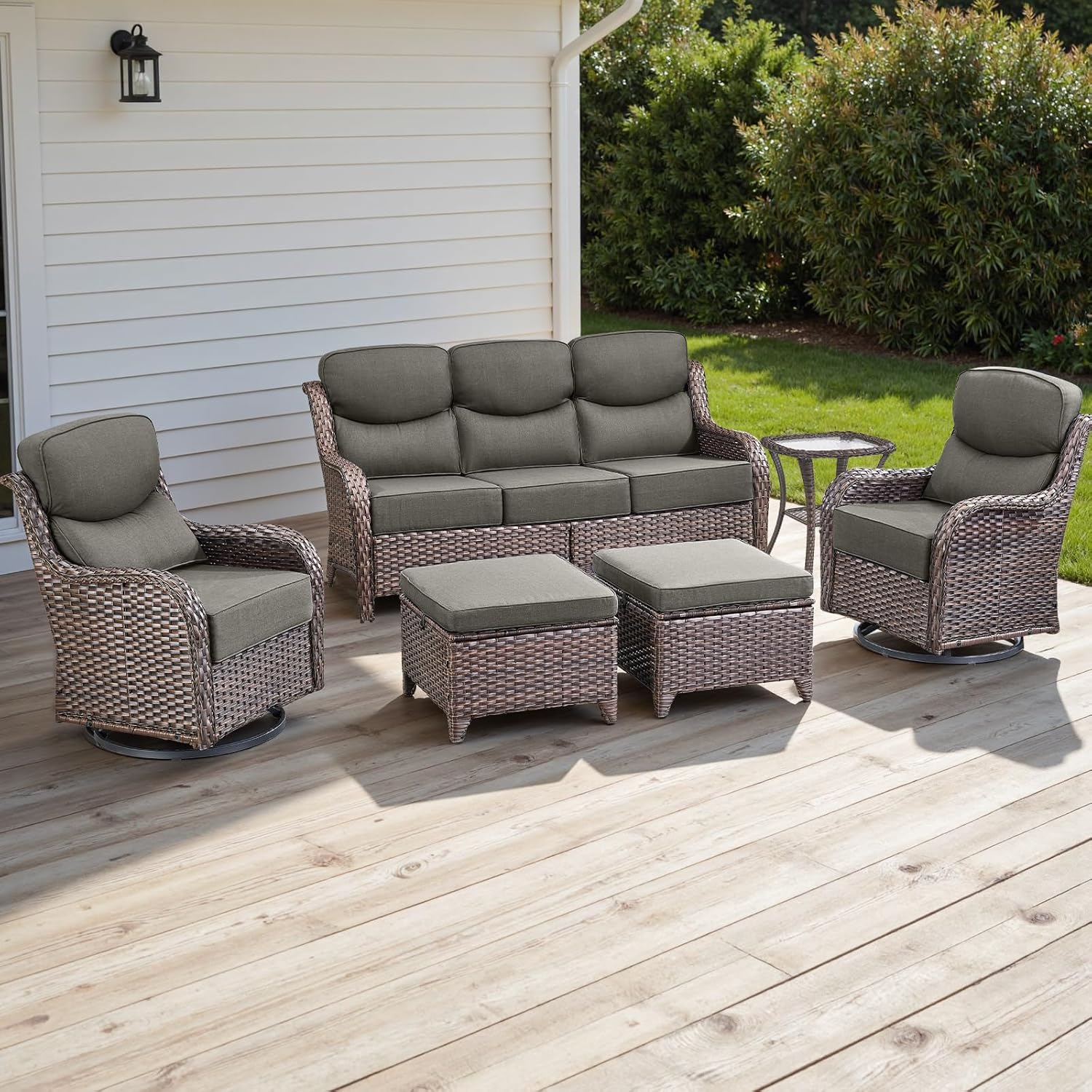Wicker Outdoor Patio Furniture Set - 6 Piece Patio Conversation Sets with Swivel Rocker Chairs, Ottomans, Sofa and Side Table, 6 inch Cushions, Waterproof Wicker, for Porch Deck Brown/Grey