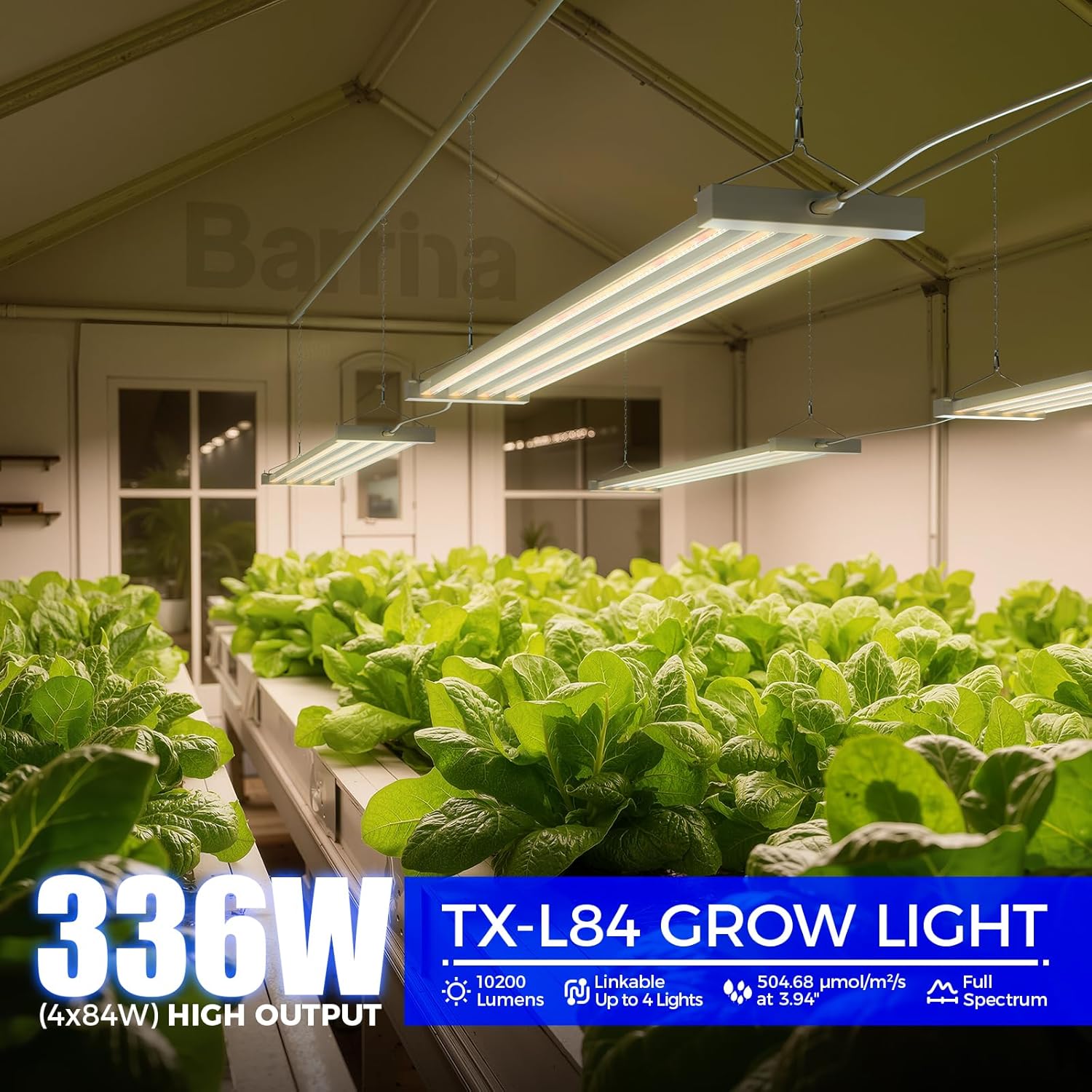 - Maximized Coverage & 336W High Power: Barrina TX-L84 grow light feature 4 LED panels for maximum coverage. Positioned 11.8" from plants, they cover an area of 47.24"×19.69", evenly lighting multiple plants. They consuming only 336W (4 x 84W) replaces 3680W traditional plant light. Over 95% light absorption accelerates growth, and boost yields