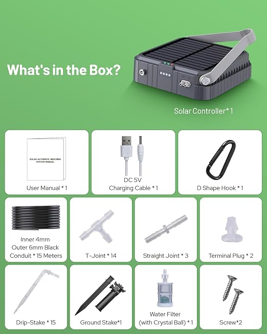 - 🌻Effortless Watering Solution🌻 Our automatic watering system offers three placement options, perfect for balconies, terraces, and small gardens lacking access to a faucet or fixed power source. ✅No Worry for Power Supply✅ Equipped with visual battery indicators, the system can be charged via external power when solar energy is insufficient. Its high-capacity battery ensures up to 30 days of consistent watering.