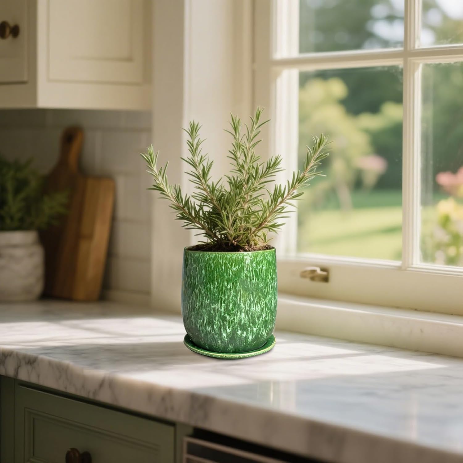 6 in Ceramic Plant Pot with Saucer,Indoor Plant Pot for Plants, Flower Pot with Drainage,Reactive Glaze Green