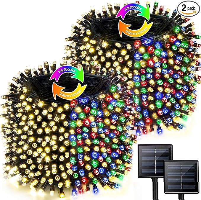 2 Pack 480 LED Solar Chrismas Lights Outdoor, 170 FT Solar String Lights for Outside with 8 Modes & Memory Function, Waterproof Twinkle Light for Xmas Tree Party Decorations (Warm White & Multicolor)
