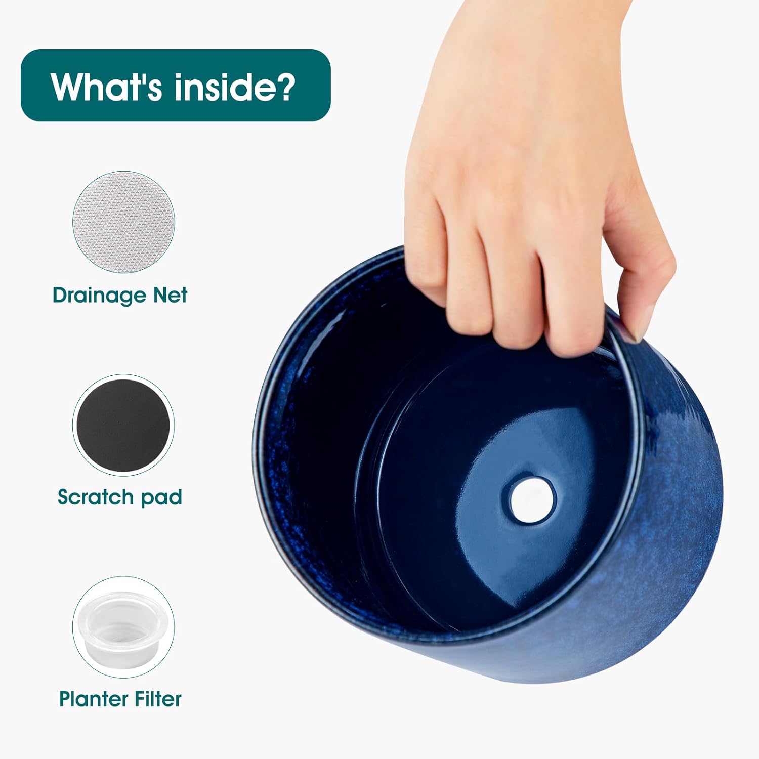 vancasso Ceramic Plant Pots, 4.25+5.25+6.25 Inch Planter Pot with Drainage Hole, Flower Pots for Indoor Outdoor Plants, Set of 3, Blue