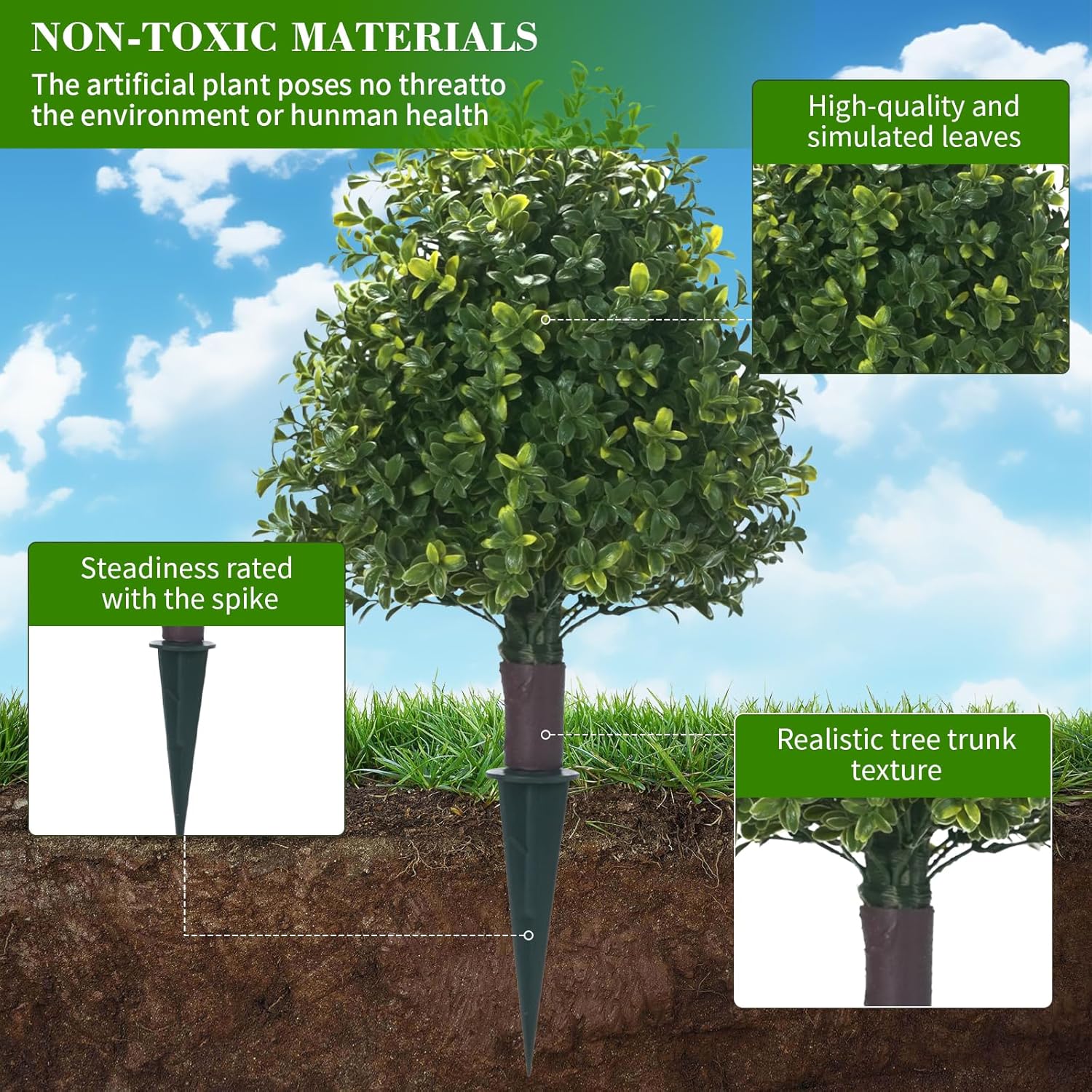 - Easy Setup with Reinforced Ground Spike: Designed with a convenient ground spike, this UV-resistant artificial boxwood topiary tree is incredibly easy to set up. Simply place it in soil, a planter, or a decorative pot to instantly enhance your space with greenery that looks fresh year-round.