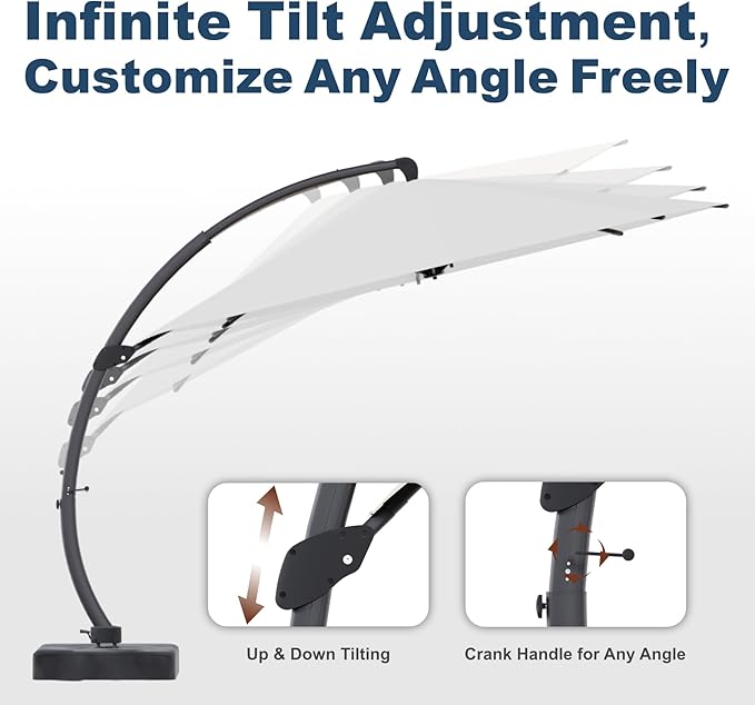 - Elegant & Functional Design: Featuring a sleek curved aluminum pole and an easy-to-use crank system, this 11FT cantilever umbrella combines style with convenience. The high-quality 220g PA waterproof polyester canopy provides excellent UV protection while resisting fading for long-lasting use.