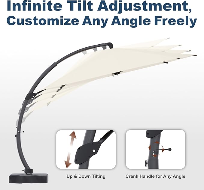 - Elegant & Functional Design: Featuring a sleek curved aluminum pole and an easy-to-use crank system, this 12FT cantilever umbrella combines style with convenience. The high-quality 220g PA waterproof polyester canopy provides excellent UV protection while resisting fading for long-lasting use.