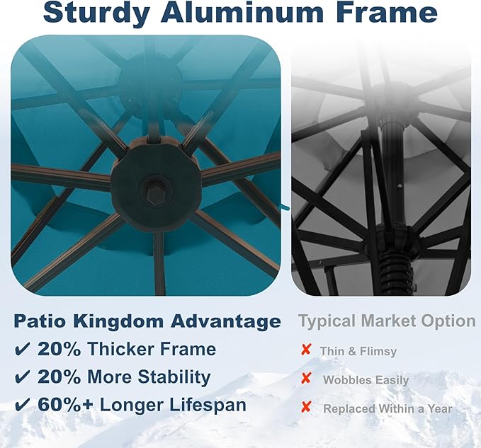 - Sturdy & Wind-Resistant Frame: Built with 8 heavy-duty aluminum ribs and a reinforced powder-coated aluminum pole, this umbrella ensures exceptional stability and durability. The vented top design enhances airflow, improving wind resistance and cooling the shaded area.