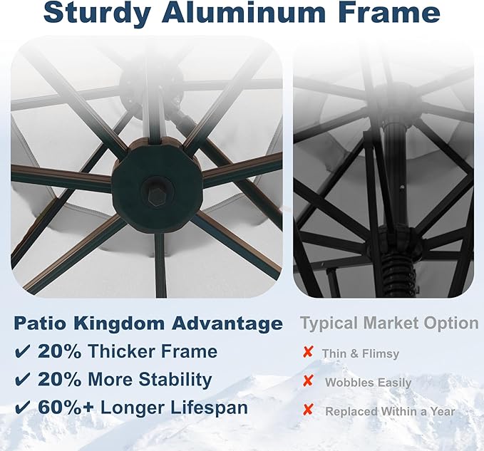 - Sturdy & Wind-Resistant Frame: Built with 8 heavy-duty aluminum ribs and a reinforced powder-coated aluminum pole, this umbrella ensures exceptional stability and durability. The vented top design enhances airflow, improving wind resistance and cooling the shaded area.