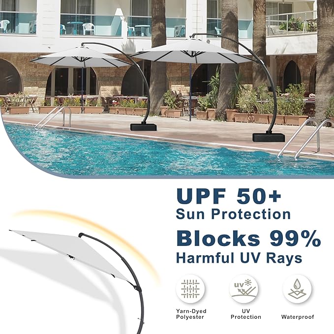- Elegant & Functional Design: Featuring a sleek curved aluminum pole and an easy-to-use crank system, this 12FT cantilever umbrella combines style with convenience. The high-quality 220g PA waterproof polyester canopy provides excellent UV protection while resisting fading for long-lasting use.