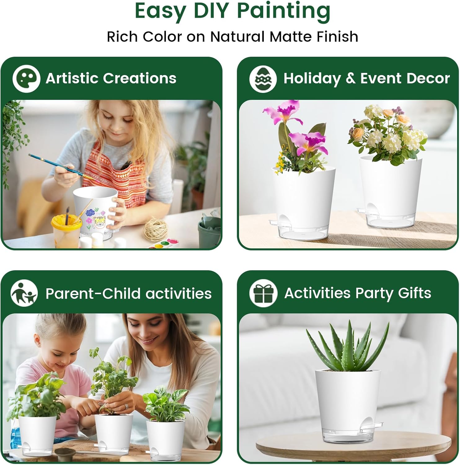 - 【Multi-Purpose and DIY Friendly】These self watering planters for indoor plants are perfect for growing cacti, succulents, aloe vera, african violets, herbs, and snake plants. Spark creativity! Color or DIY these self-watering planters- a fun project to grow plants & memories with kids.