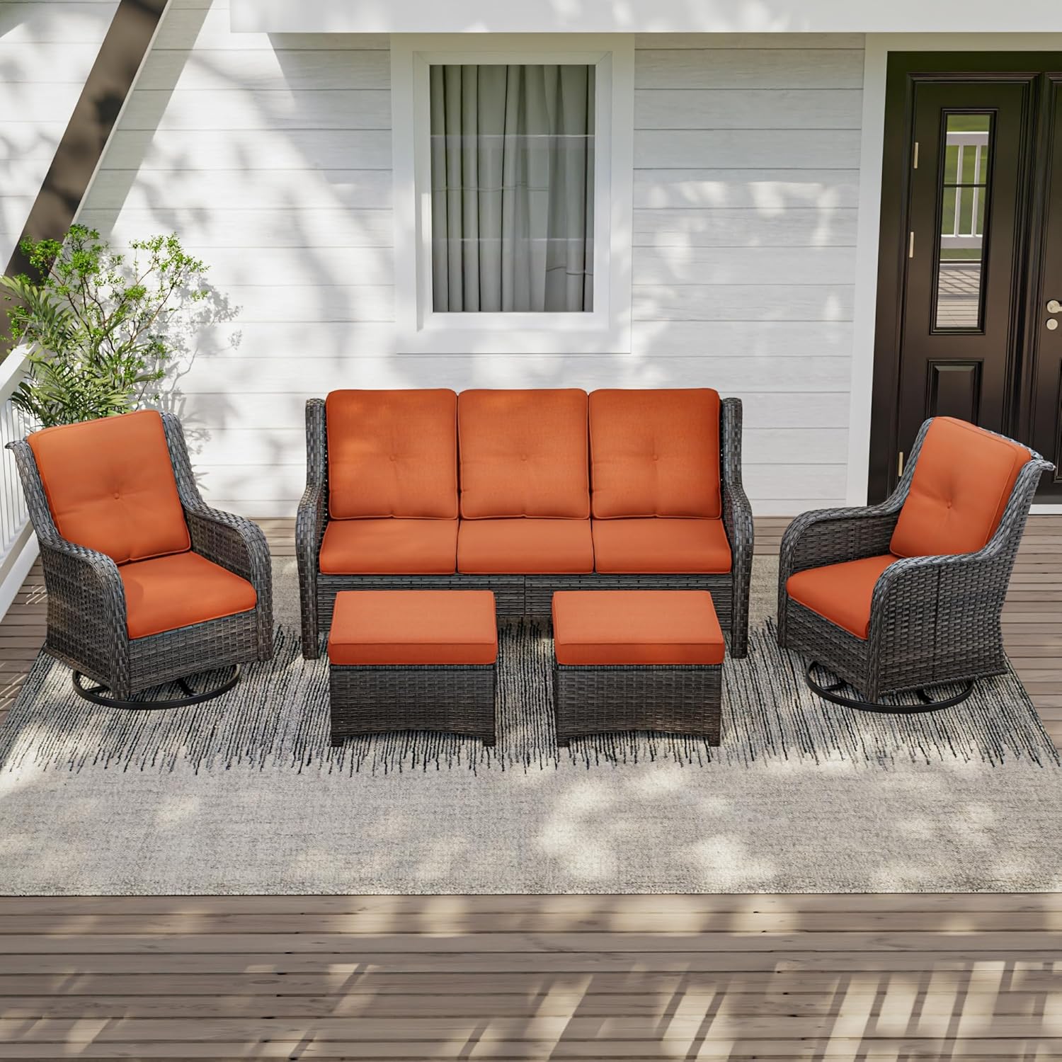 5 Pieces Outdoor Patio Furniture Set - Conversation Set Includes Wicker Swivel Rocker Chairs Set of 2, 2 Ottoman, 3-Seat Sofa, Suitable for Porch, Yard, Mixed Brown Rattan, Orange