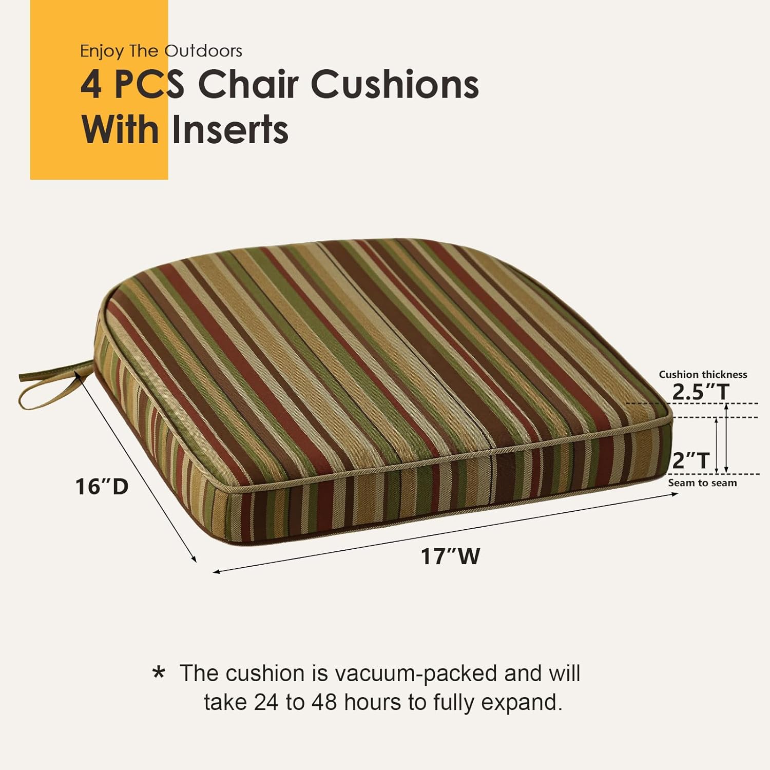 - Chair Cushion Set of 4: Each pack includes 4 Chair cushions measuring 17"W x 16"D x 2"T. Measure the seating area of your furniture to ensure their size is right.