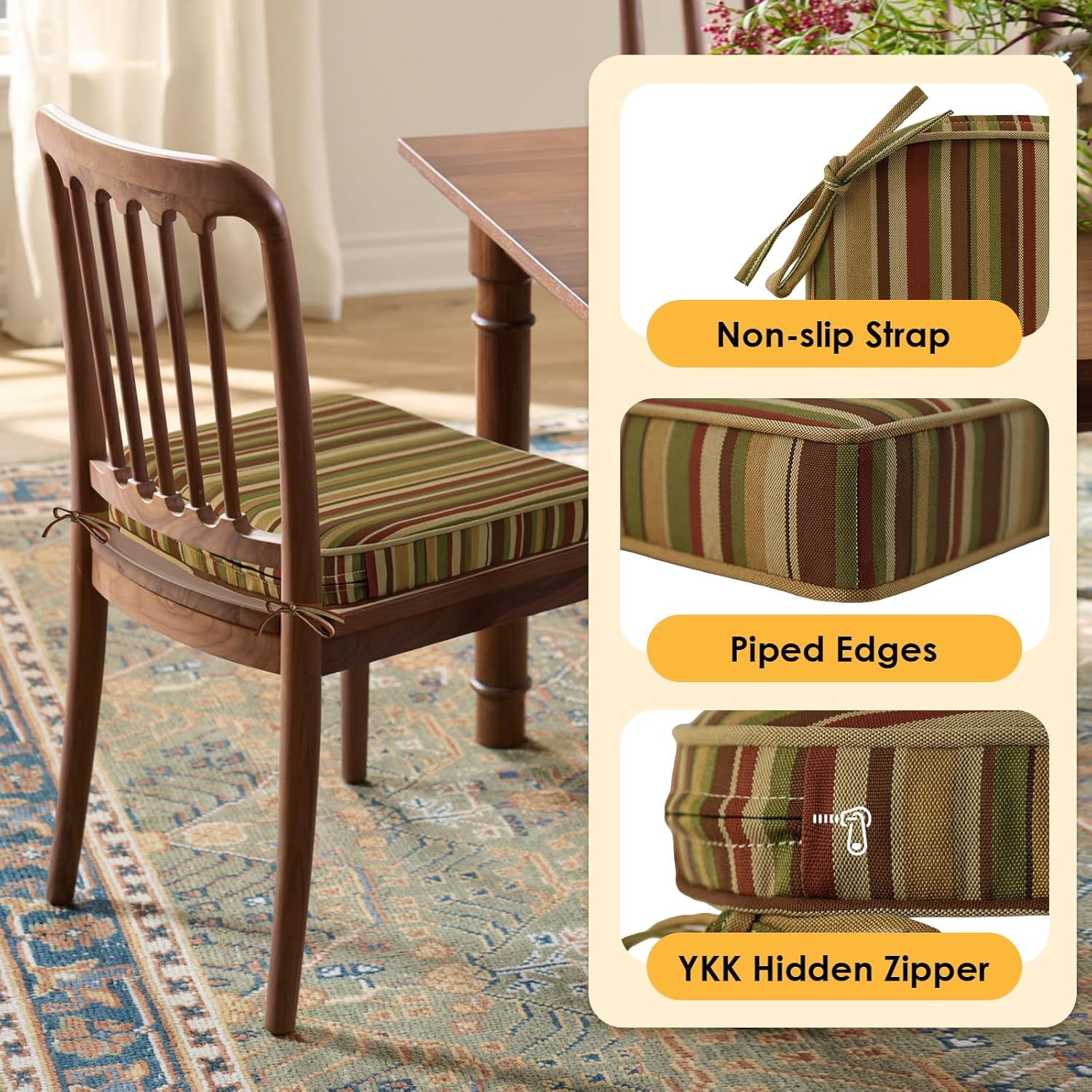 - Non-slip Ties & Piped edge: There are 2 straps on each side of the outdoor furniture cushions to keep stable and feature piped edges for a polished look and superior durability.