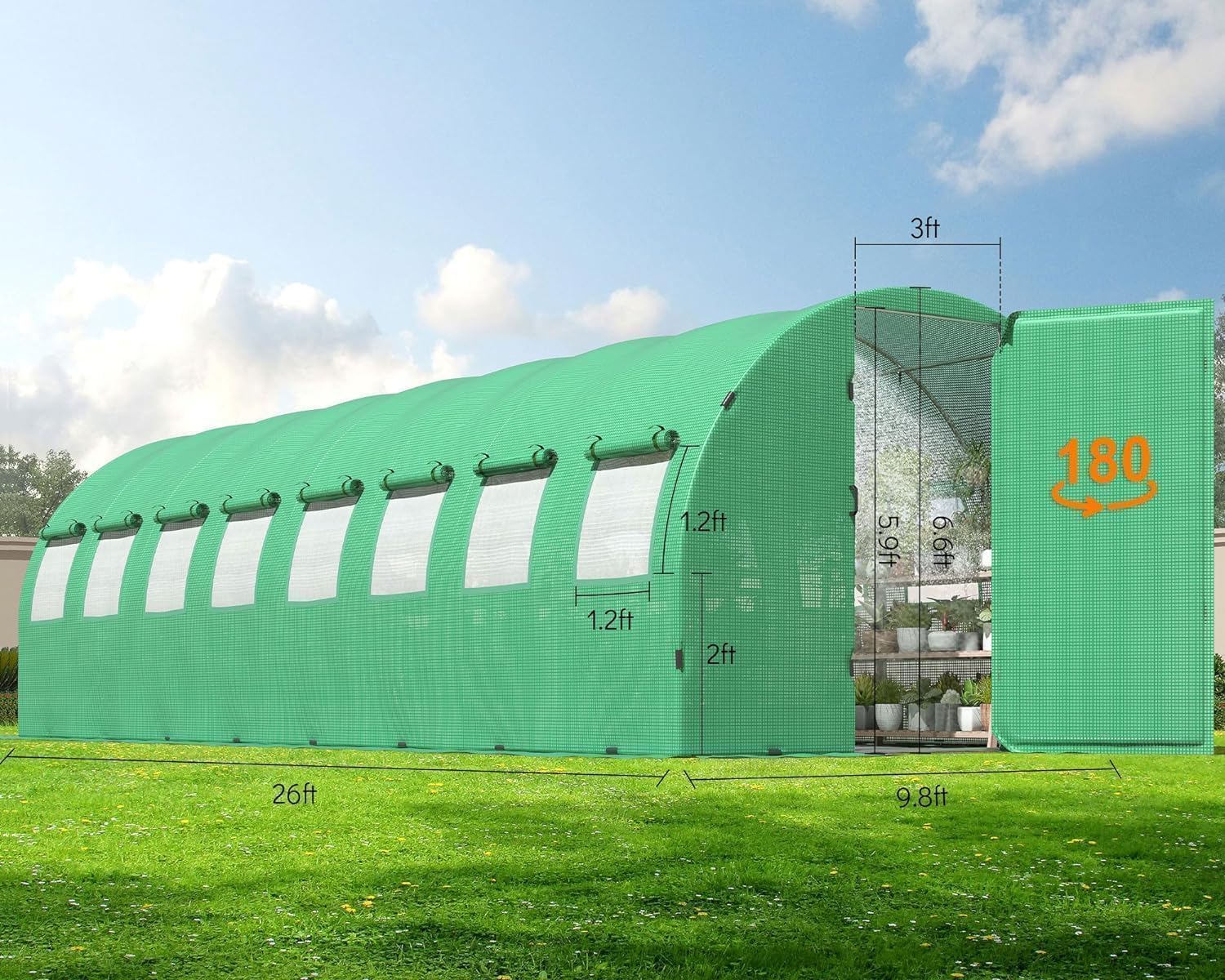 - 360 Degree Smart Watering Greenhouse Patent Design: The tunnel greenhouse is more water and time efficient than a regular backyard greenhouse. The patented design of water-saving devices can save water most by adjusting the water size, scope, and intensity