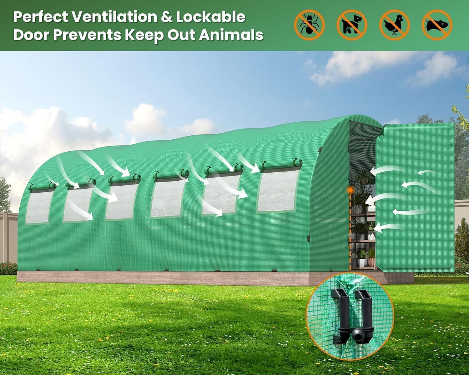 - Upgraded Lockable Swing Door: Freely enter and exit the Large greenhouses with the adjustable 180-Degree door frames. Swing doors can be locked by latches, and 16 windows, keep other troublemakers away from your garden greenhouse while maintaining air circulation