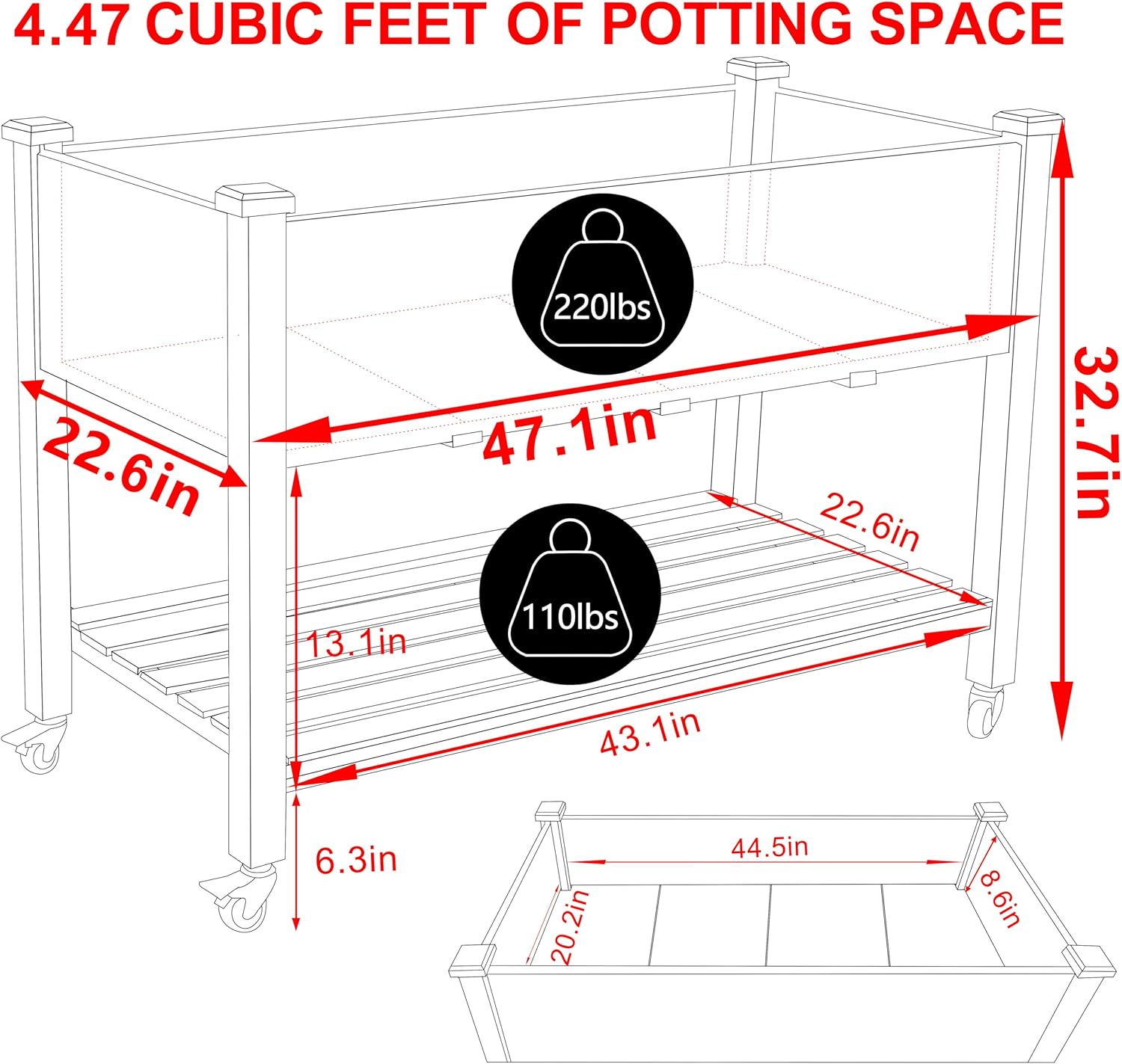 - DIMENSION-The overall size of raise garden bed: 47.1''W x 22.6''D x 32.7''H. The depth of raised garden bed: 8.6''. The height of legs:19.4''. The height from shelf to ground: 6.3''. The height from shelf to the raised garden bed: 13.1''. The weight capacity of raised garden bed: 220lbs. The weight capacity of shelf: 110lbs. The maximum potting space capacity: 4.47 cubic feet.
