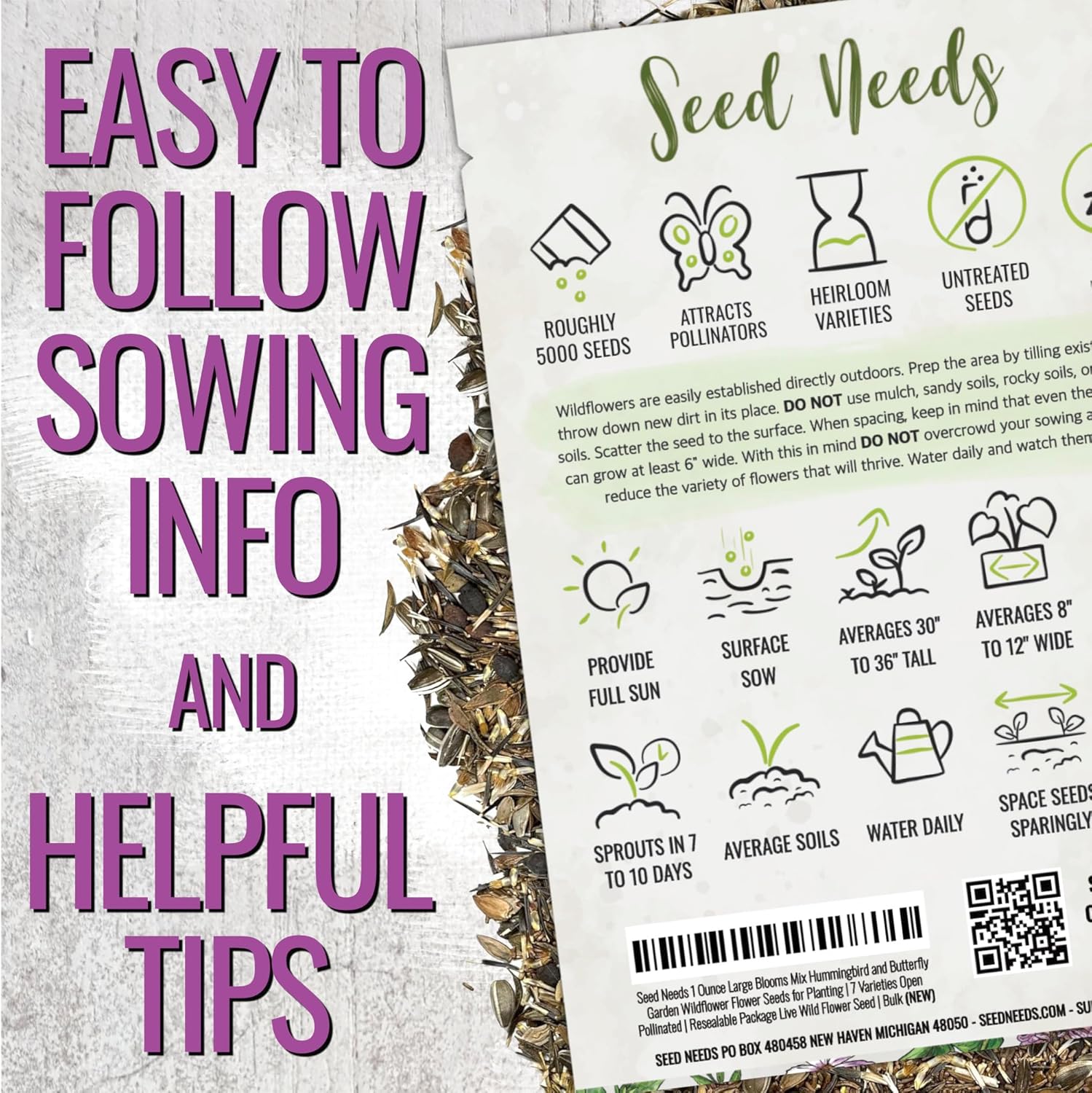 Seed Needs Garden Flower Seeds Large Blooms Mix Hummingbird and Butterfly | 10 Packs (1 Ounce Each) No Filler 7 Varieties Open Pollinated | Resealable Package Live Wild Flower Seed | Bulk