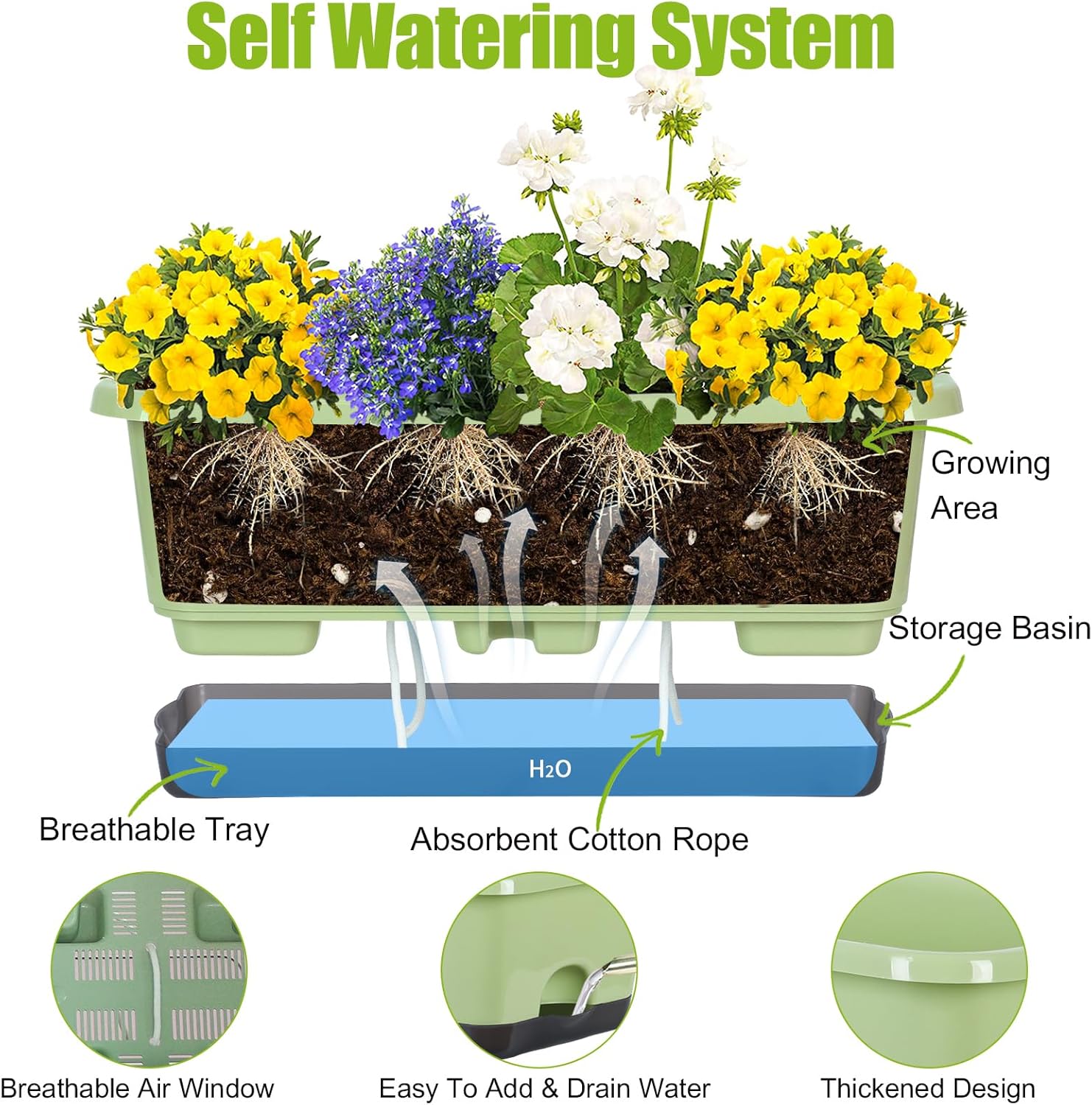 - 【Innovative Self Watering Design】We have absorbent cotton rope for each plant pot, the absorbent cotton rope connects with the water reservoir and plants grow pots, allowing roots and soil to wick water from the reservoir.And keep your plants growing healthily.Our pots are designed with many water drainage holes and air holes on the bottom, which greatly improve air circulation and prevent root rot.