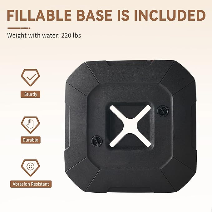 - Patio Umbrella with Base Included: The outdoor cantilever umbrella includes a fillable umbrella base, The base needs to be filled with 90% sand and 10% water, weighs up to 220 lbs with water and sand after fully filled; The base will be delivered separately, so you won't receive both the umbrella and the base at the same time