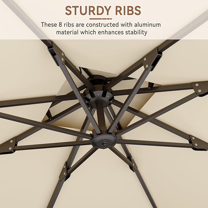 - Thickened Frame: Aluminum main pole is rust resistant, enhancing the stability of your patio umbrella; 8 thickened ribs make the cantilever umbrella more stable in windy conditions; Powder coated design increases the durability of the umbrella