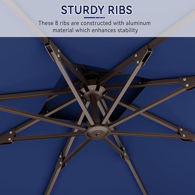 - Thickened Frame: Aluminum main pole is rust resistant, enhancing the stability of your patio umbrella; 8 thickened ribs make the cantilever umbrella more stable in windy conditions; Powder coated design increases the durability of the umbrella