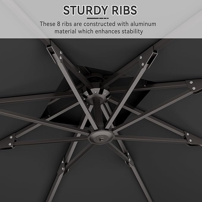 - Thickened Frame: Aluminum main pole is rust resistant, enhancing the stability of your patio umbrella; 8 thickened ribs make the cantilever umbrella more stable in windy conditions; Powder coated design increases the durability of the umbrella