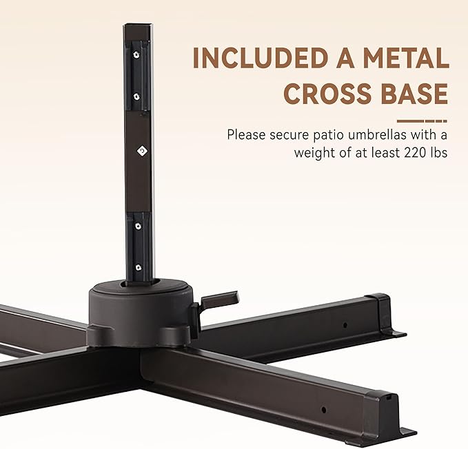 - Cantilever Umbrella: The patio umbrella has a metal cross base, you can secure in other ways to ensure the stability of the outdoor umbrella; If you need to use the base to enhance the stability of the umbrella, a over 220 lbs umbrella base is recommended