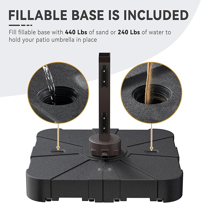 - Patio Umbrella with Base Included: The base can be filled with water or sand, the total weight is up to 240 lbs with water and 440 lbs with wet sand; They will be shipped in two packages from different warehouses; So they will not arrive at the same time