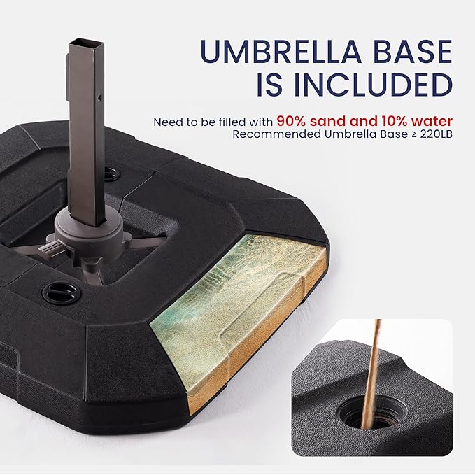 - Patio Umbrella with Base Included: The base needs to be filled with 90% sand and 10% water, the total weight is up to 220 lbs with fully filled; Base and umbrella will be shipped in two packages from different warehouses; So they will not arrive at the same time