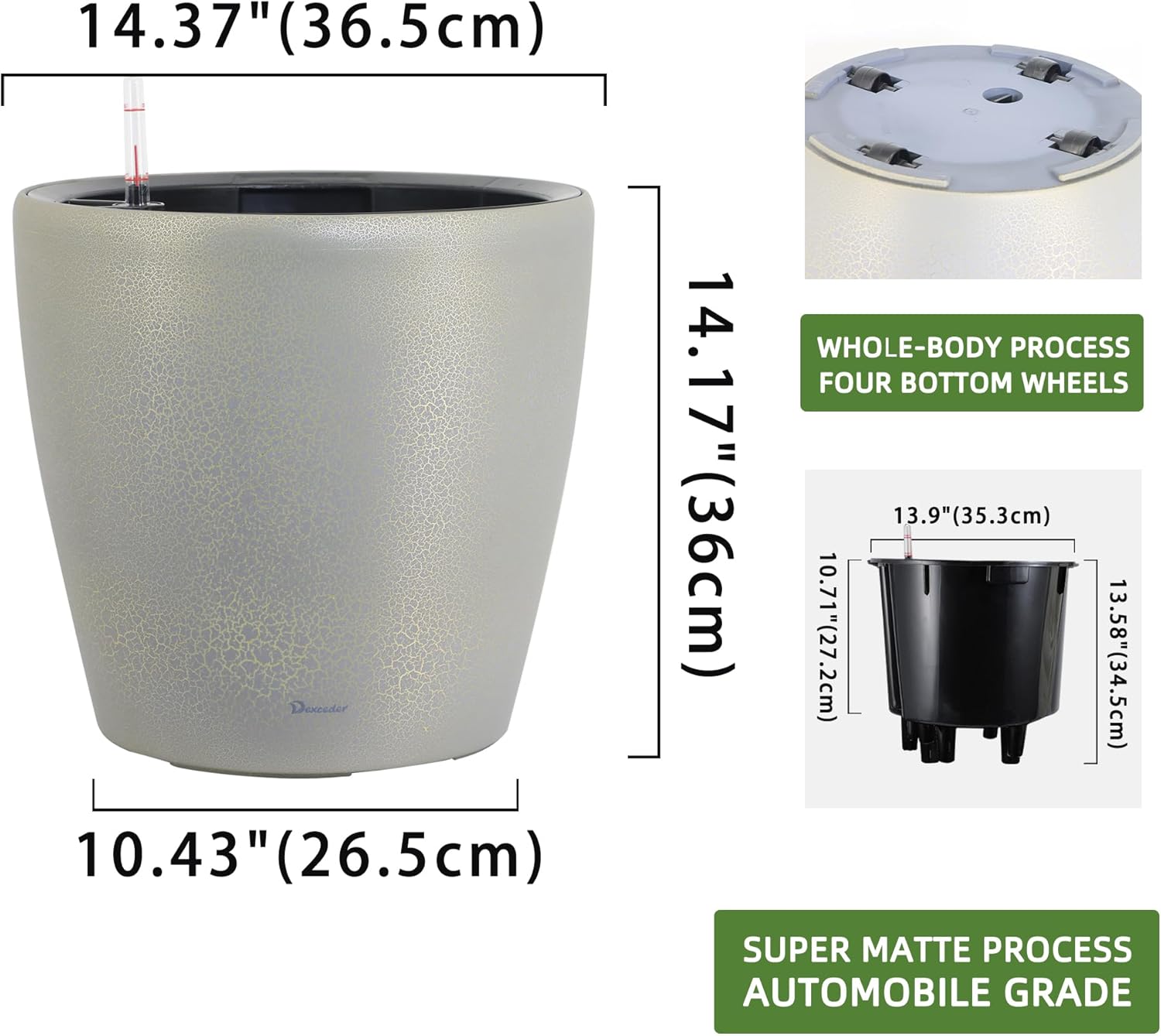 Dexceder 15x14 Self Watering Planter with Wheels Indoor Outdoor, Inner Pot Design, Thickened Large Floor Standing Flower Plant Pot with Water Level Indicator (Grey Gold Crackle)