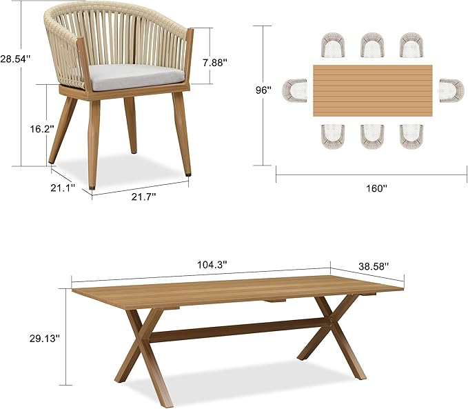 - The all-weather dining table set includes: 1 X dining table (104.3"L x 38.58"W x 29.13"H), 8 X dining chairs (21.7"L x 21.1"W x 28.5"H), and 8 X cushions.