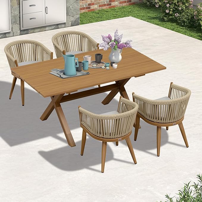 PURPLE LEAF 5 Pieces Outdoor Dining Set with Patio Aluminium Dining Table and Wicker Chairs Modern Furniture Cushions Sets for Backyard Indoor Decor Kitchen Teak
