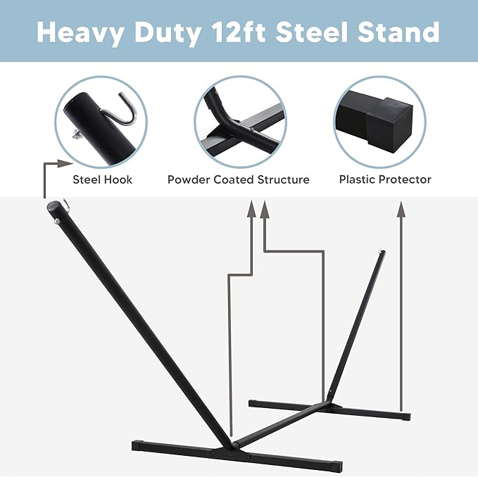 - Freestanding Hammock with Portable Stand: No damage to trees. Created to be stable and long-lasting, the 12 ft stand is made from powder-coated heavy gauge steel. It can be easily assembled in minutes without any tools, and it could be disassembled easily. Feel free to contact us if you have any questions during use within one year of purchase. We are always here to help