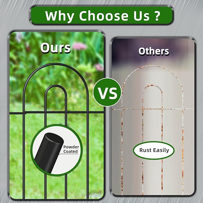 - The decorative garden fences is made of high quality metal, durable black powder coated to prevent rust. This small fence for garden is also very convenient and practical in terms of practicality. Outdoor fencing for yard can not only protect flowers and plants, but also the arched design will become the best decorative element in your garden, metal fence panels adds new scenery to our garden.