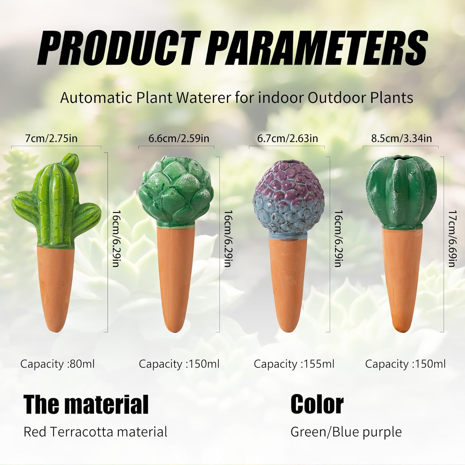 - Versatile Four-Pack Value Set for Comprehensive Plant Care: This practical set includes four handcrafted terra cotta watering spikes in varying dimensions (approx. 3.35"x1.77"x6.69", 2.64"x2.64"x6.30", 2.76"x2.76"x6.30", 2.60"x2.60"x6.30") to accommodate different pot sizes and plant water needs. Offering exceptional value, these self watering planter inserts provide a complete and economical watering solution, making them the perfect plant self watering devices for all plant lovers and gardeners.