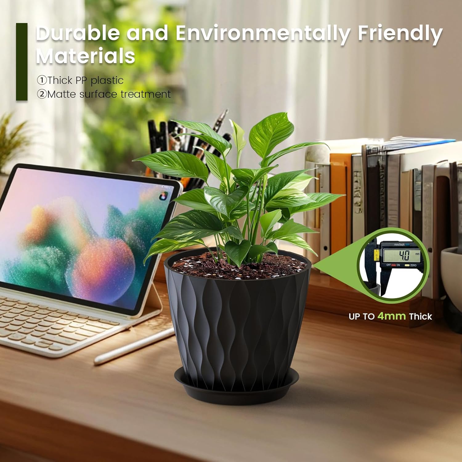 7 inch Plant Pots for Indoor Outdoor Plants, 5 Pack Thick Nursery Pots with Drainage Holes and Saucers, 3D Modern Wave Texture Plastic Planter Pots for Flowers and House Plants, Black