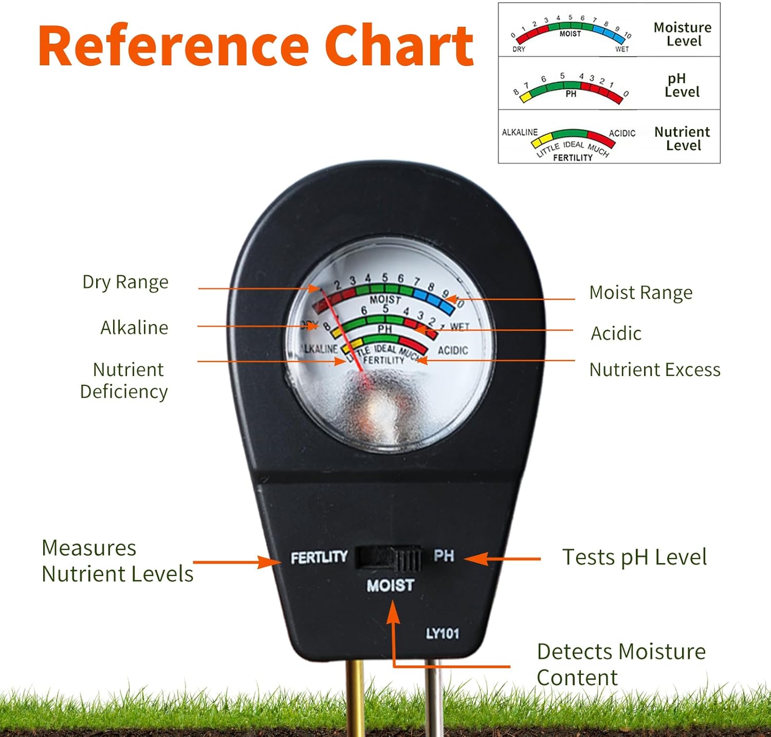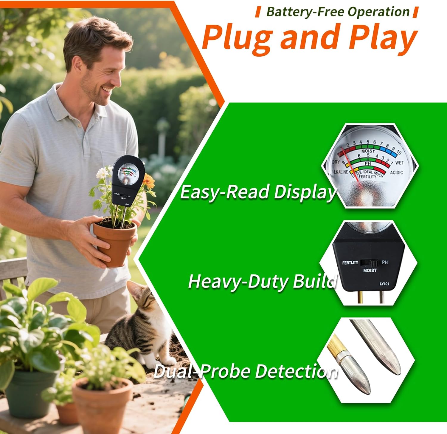 - 3-in-1 Soil Testing: Moisture, pH & Fertility in One Tool:This all-in-one soil test kit combines Soil Moisture Meter, Soil pH Meter, and Fertility Soil Tester functions. Instantly measure critical soil health metrics with two probes. The oversized dial displays precise readings (0-10 scales) in seconds, empowering you to optimize watering, adjust pH levels, and boost nutrient supply for thriving plants. No guesswork – just science-backed gardening