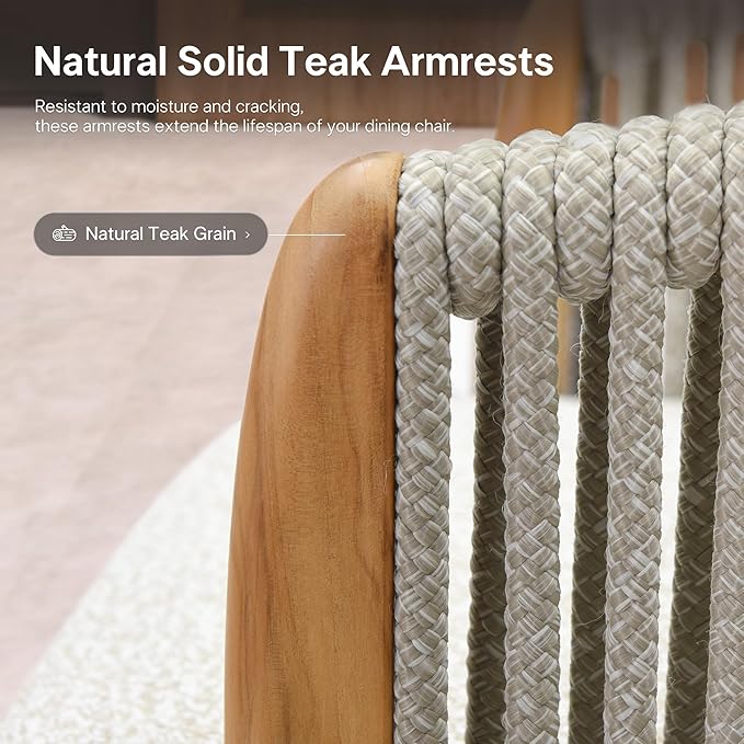 - Teak & Rope Accents: The outdoor dining chair features smooth teak wood armrests and durable hand-woven 0.6" thickened rope backrests that add natural elegance and strong support.