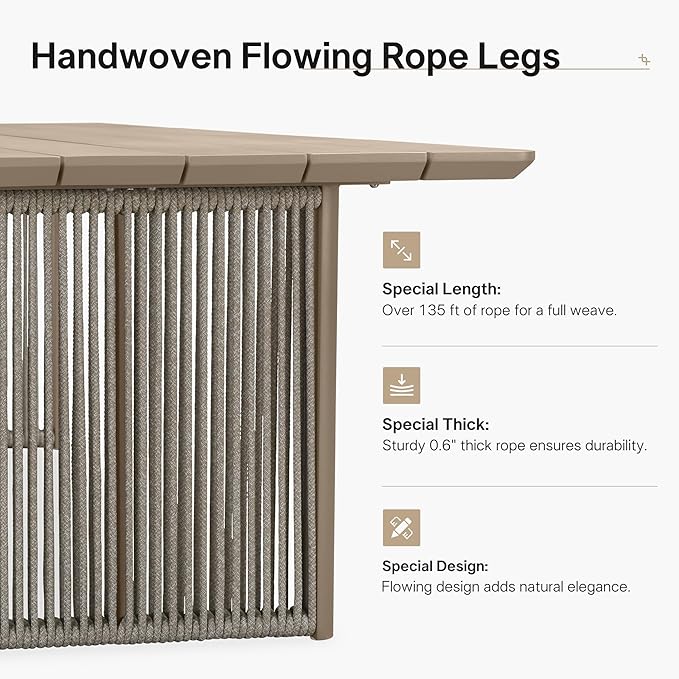 - Premium Outdoor Table:Handwoven from sturdy rope, the flowing legs support a finely crafted tabletop for solid construction and natural charm.