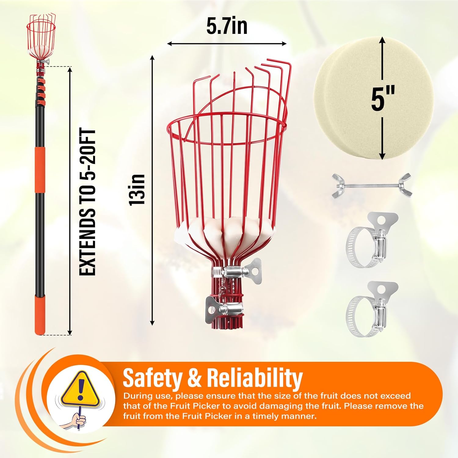 - Precision Picking: Fruit picker pole with basket has an adjustable length ranging from 5 to 20 ft pole.With handheld fruit picker, you can pick fruits within a range of up to 26 feet.Orange picker comes with a large-capacity, 5.7-inch diameter fruit picker basket to gather multiple fruits at once.The carefully engineered structure allows for accurate hooking of fruits during picking,ensuring your trees are well-maintained and making your fruit picking easier
