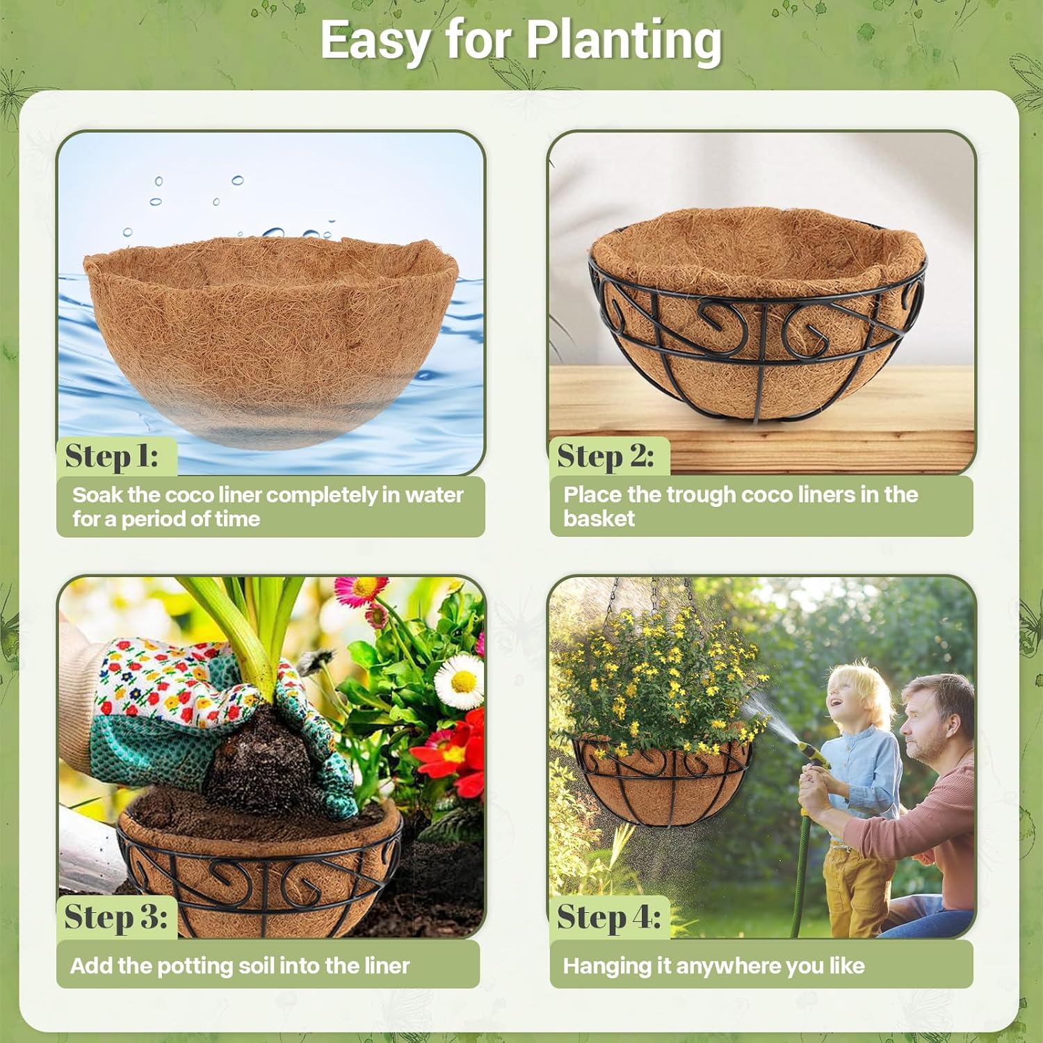 - Easy Setup and Versatile Use: Each hanging basket comes with pre-attached chains and quick-setup hooks. Simply soak the coconut liner, place it in the metal basket, add potting soil, and plant your favorite flowers or greenery. The hanging design allows for flexible positioning to maximize sunlight exposure.