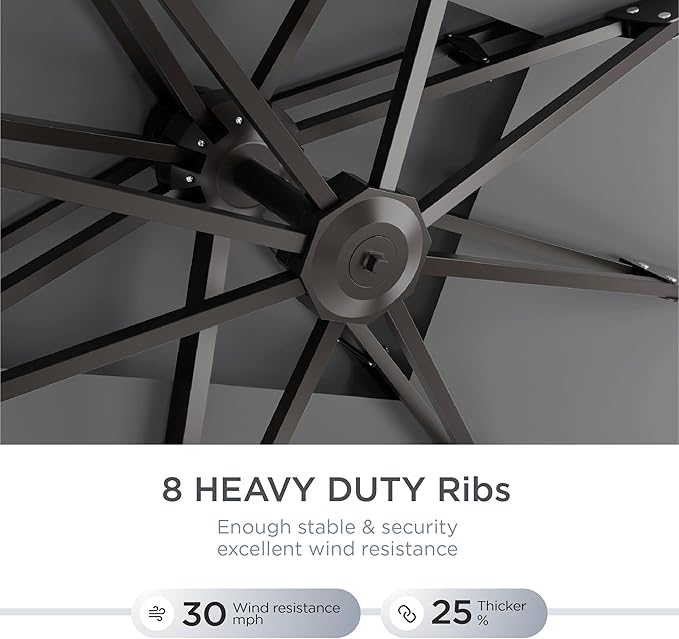 - Solid Construction: This heavy duty patio umbrella made of thickness aluminum pole and 8 heavy duty steel ribs. The triangular frame make the offset umbrella hold up steady even in decent winds