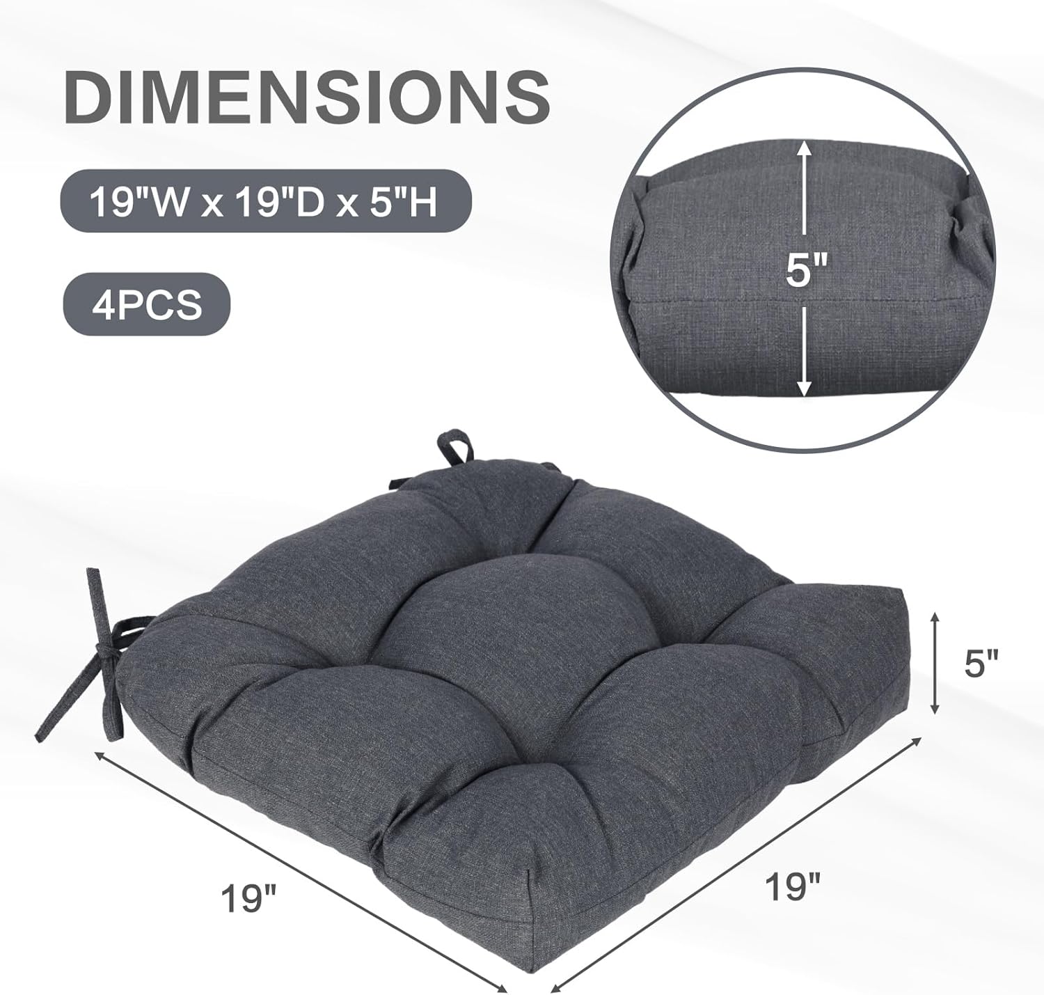 Aoodor 19" x 19" x 5" Tufted Outdoor Chair Cushions, Water Resistant & Fade Resistant Polyester Dining Chair Pads with 2 Straps for Patio Furniture, Set of 4