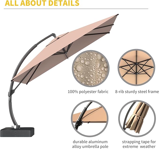- 【Reinforced Aluminum Frame with 8 Ribs】Built with heavy-duty, rust-proof aluminum pole and 8 reinforced ribs, this square cantilever umbrella is designed for long-lasting durability. The curved cantilever design enhances stability while adding modern elegance to your outdoor space.