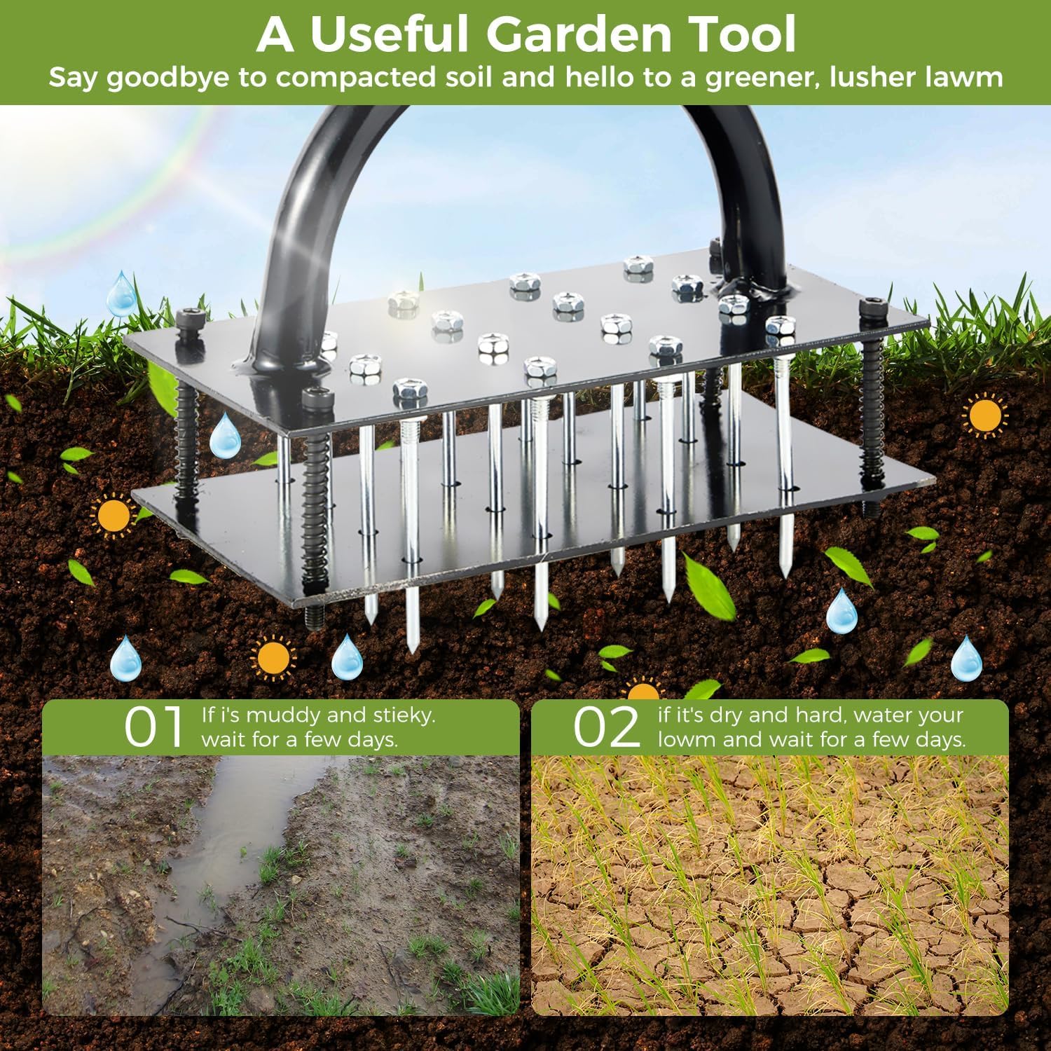 - 🍀Hand Aerator Lawn Tool: The lawn aerator can easily penetrate the bottom layer of the soil for thorough aeration, allowing air (oxygen), water and nutrients to reach the grass roots, ensuring uniform loosening and promoting healthier lawn growth. Aerator tool, help you have a healthier, beautiful and vibrant lawn/garden/yard/terrace.