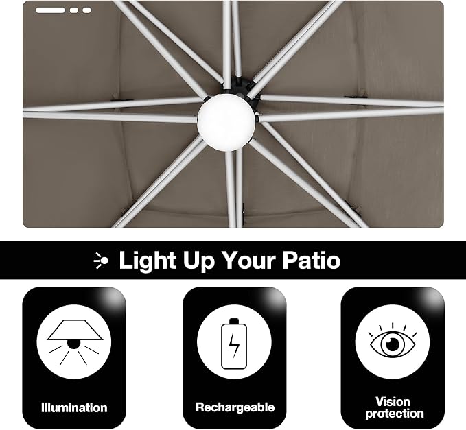 - Chargeable light: Eliteshade cantilever offset patio umbrella comes with a chargeable central light (No battery), offering brighter illumination, ensuring prolonged brightness.