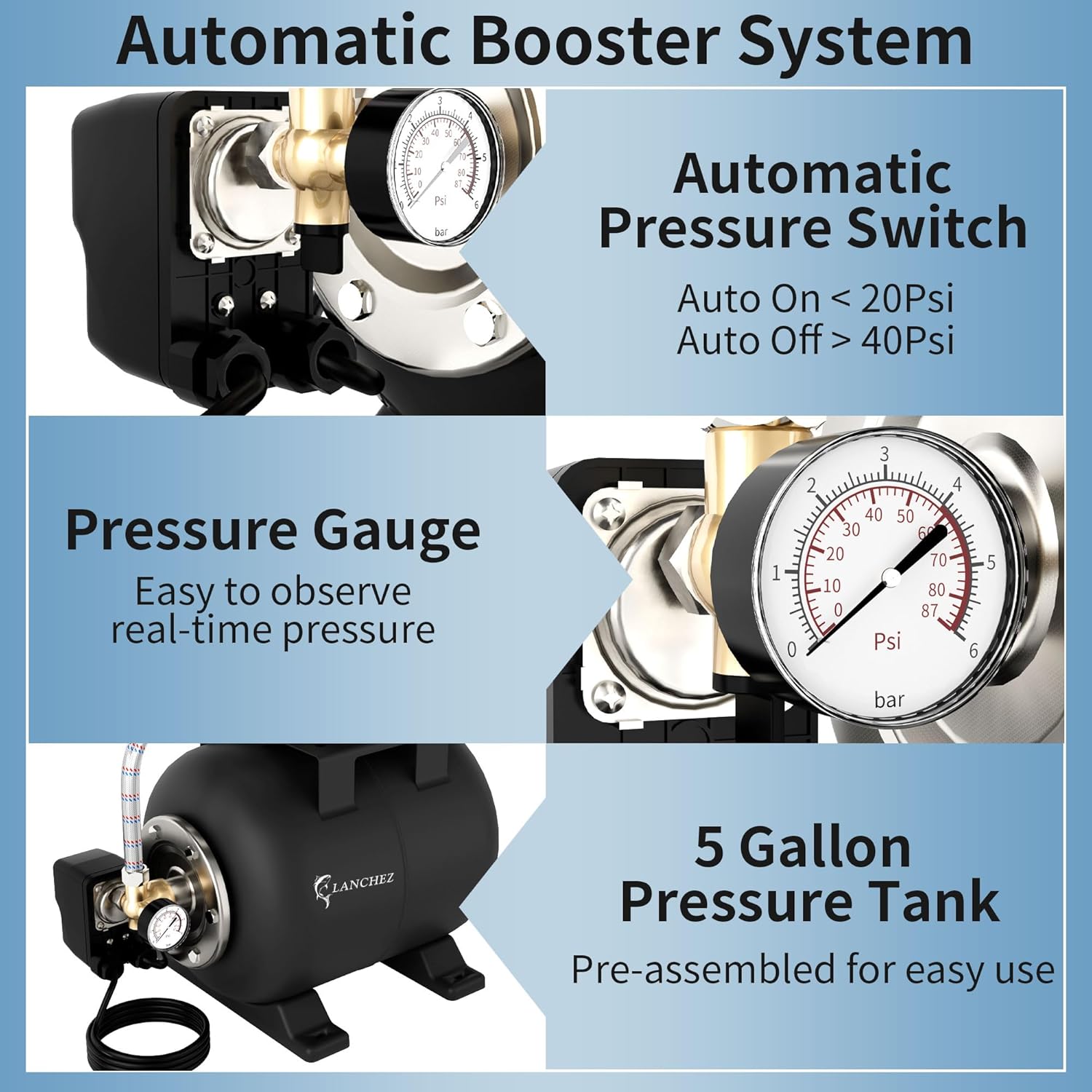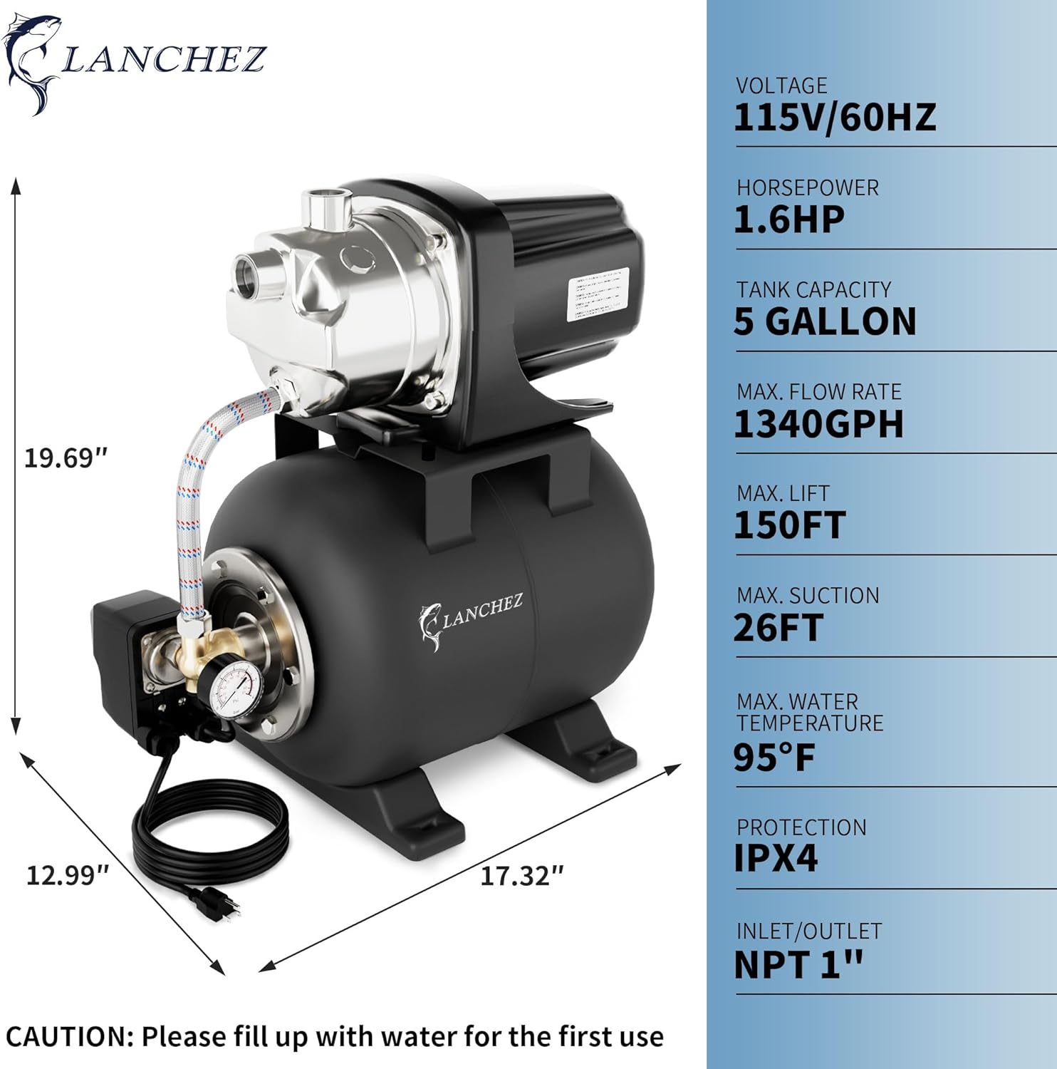 LANCHEZ 1.6HP Shallow Well Pump with Pressure Tank, 115V 1340GPH Automatic Irrigation Water Booster Jet Pump, Stainless Steel Water Transfer Pump for Home Garden Lawn Sprinkler Irrigation, Matte