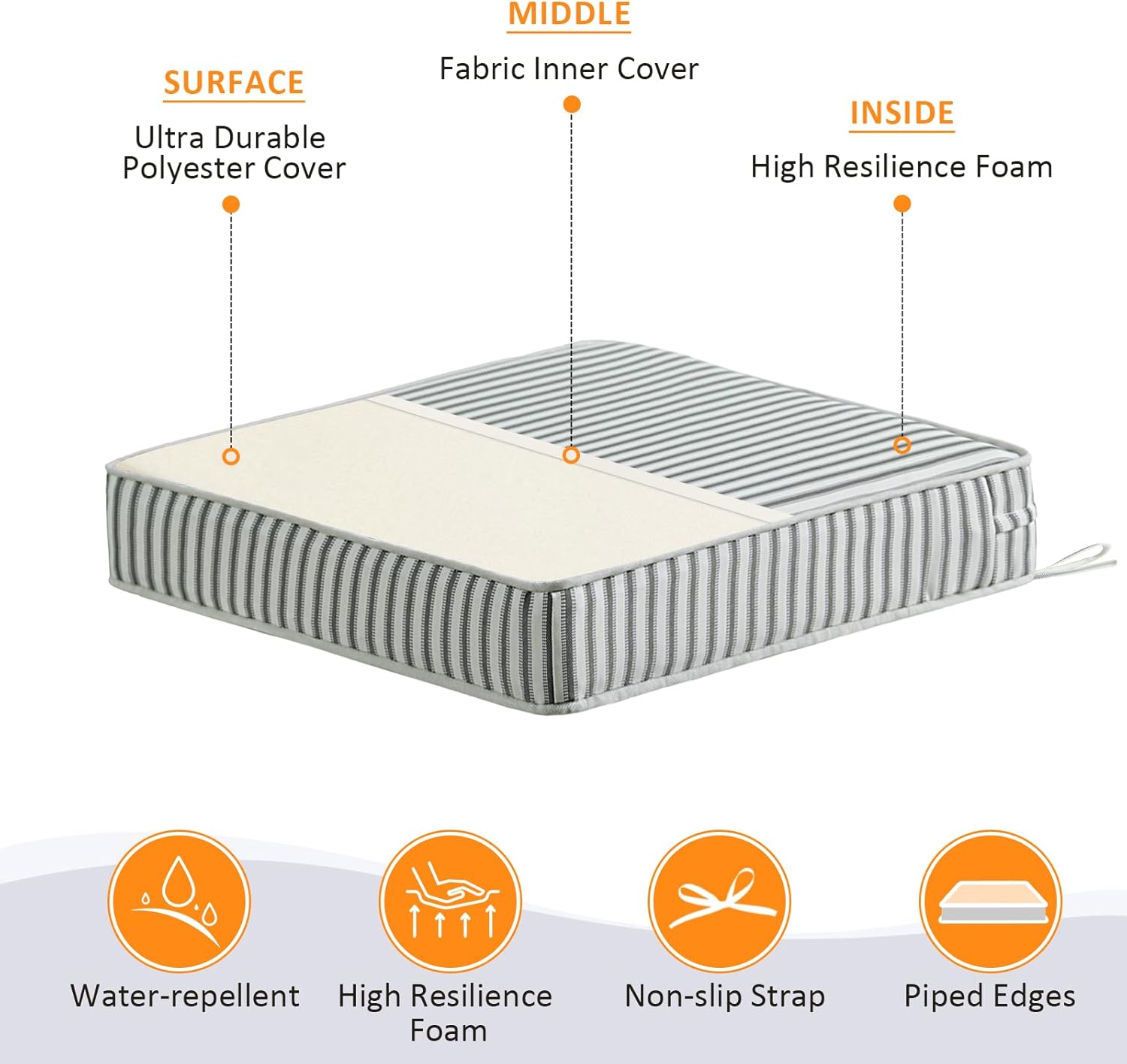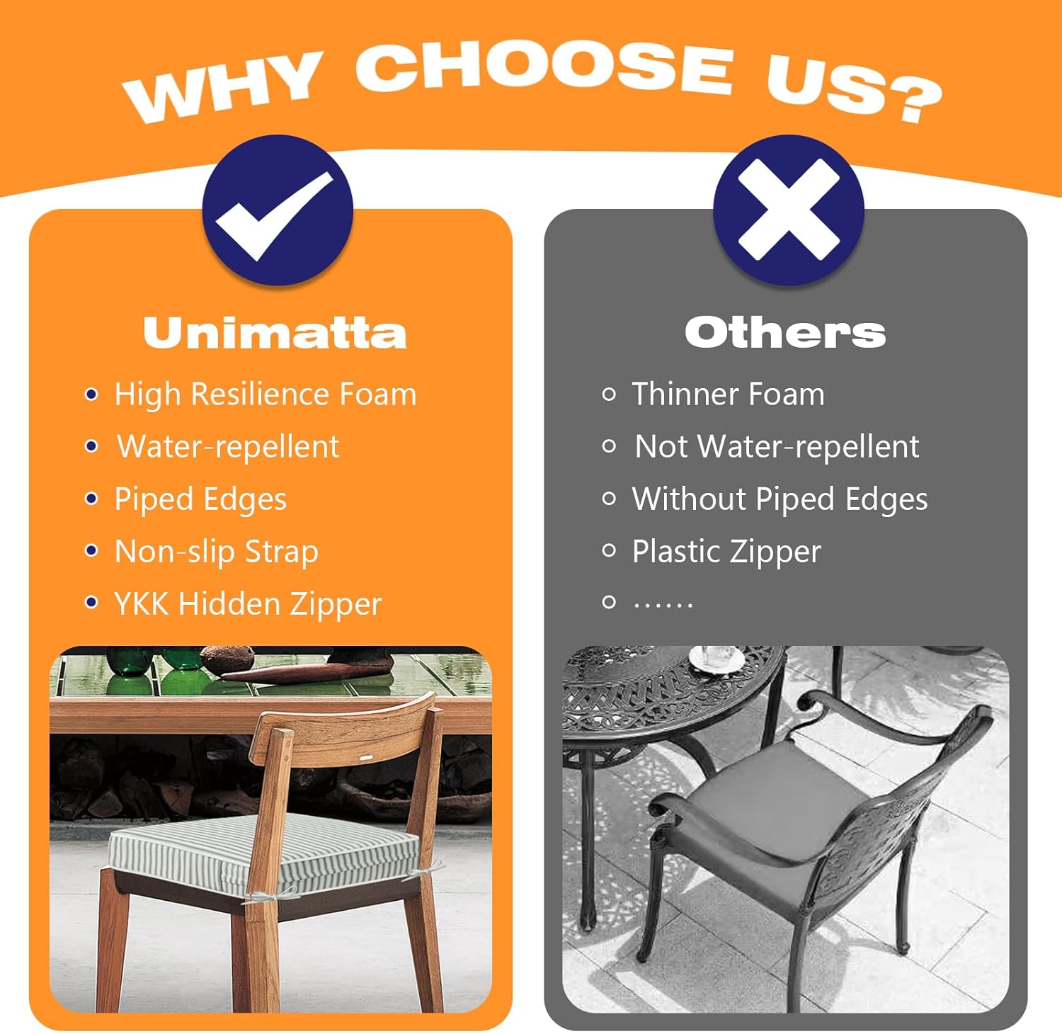 - 【High Resilience Foam】 The Unimatta chair cushions are filled with high-quality 100% foam, high-density sponge offers excellent support and long-lasing comfort. Whether you're enjoying a sunny afternoon or a cool evening, this cushion will keep you cozy.