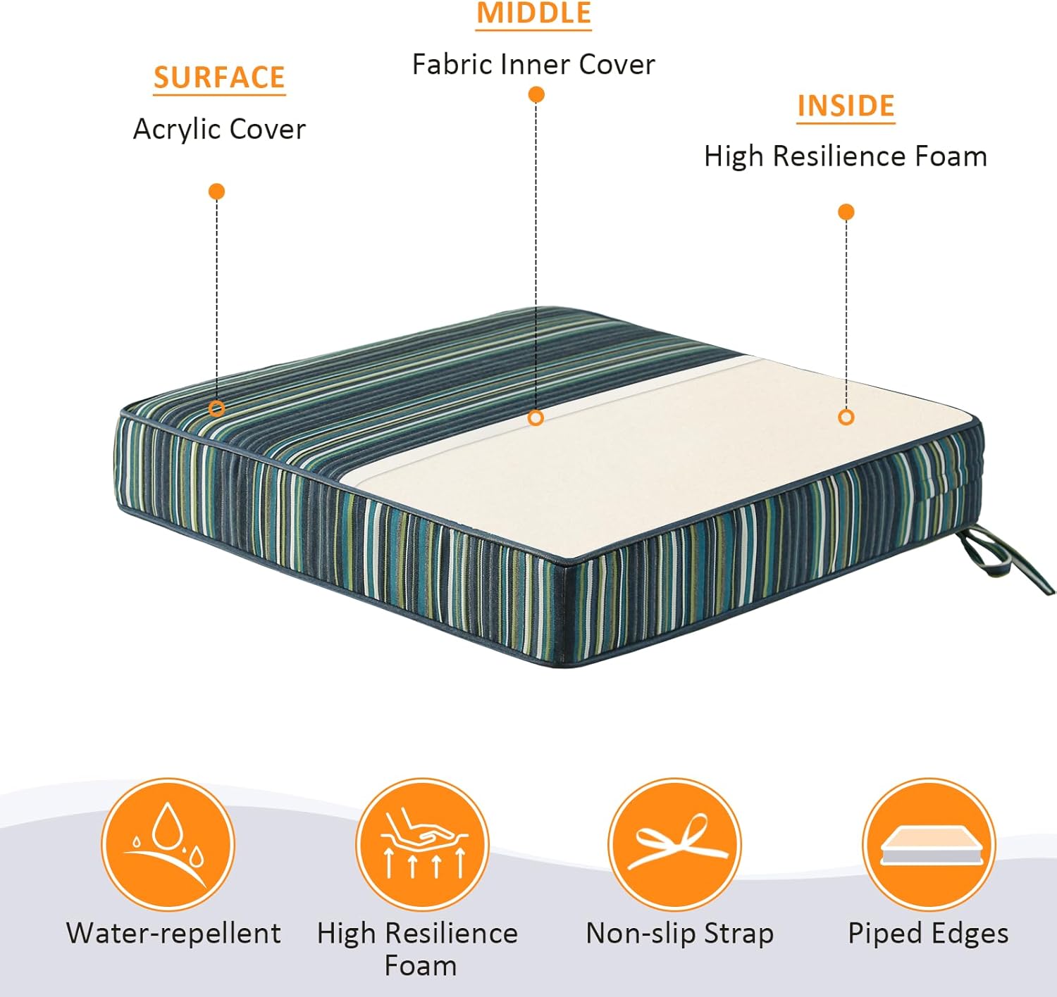 Sunbrella Square Corner Seat Cushions, 19" x 19" x 3", Set of 4, Indoor Outdoor Water Repellent Universal Chair Pads with Ties for Patio Furniture, Garden Deck Dining Chairs, Beach Stripe Lagoon