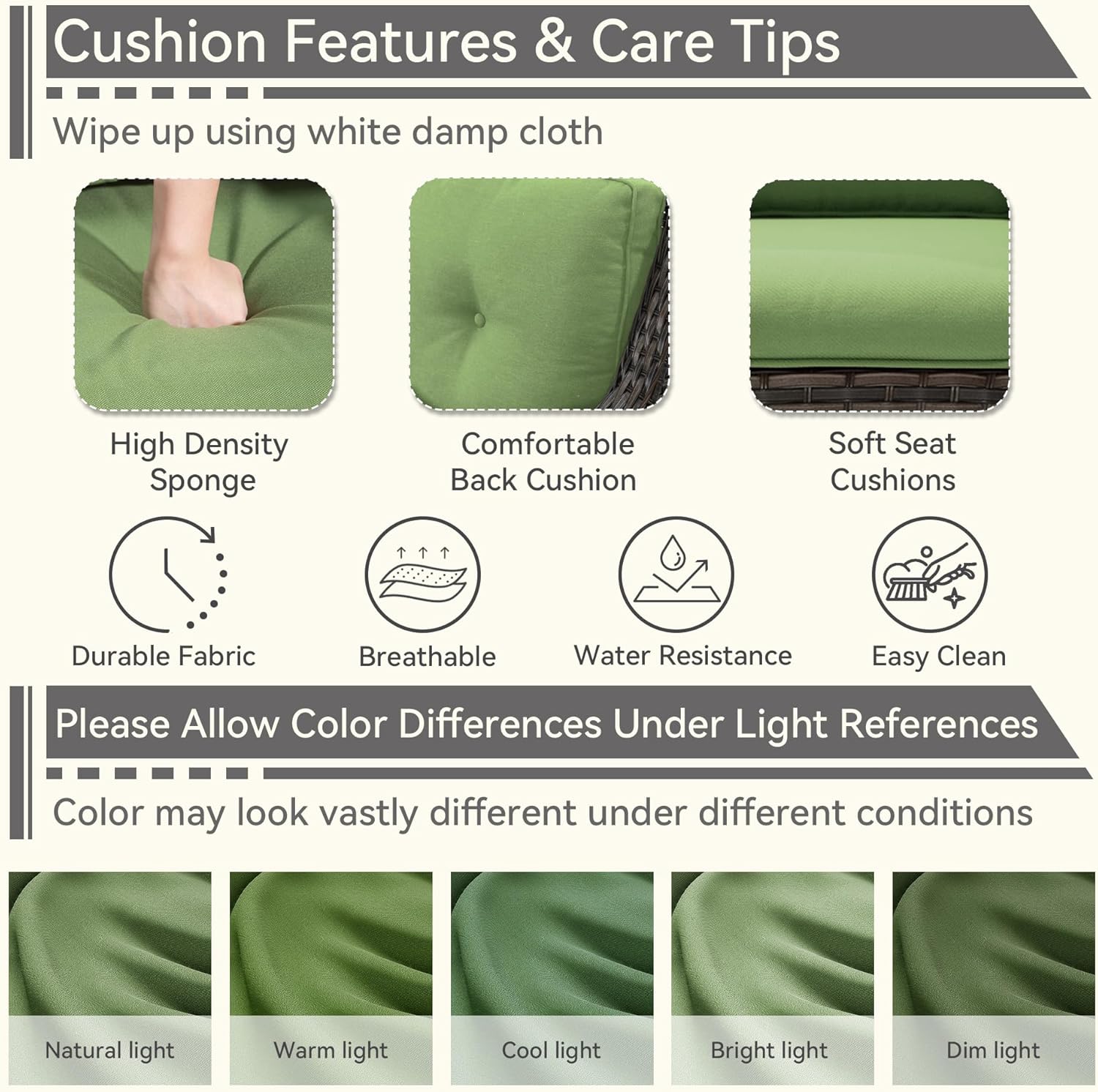 - [Easy-Clean Cushions] Wipe with a white damp cloth for easy clean. Allow for color differences in different ambient light and displays