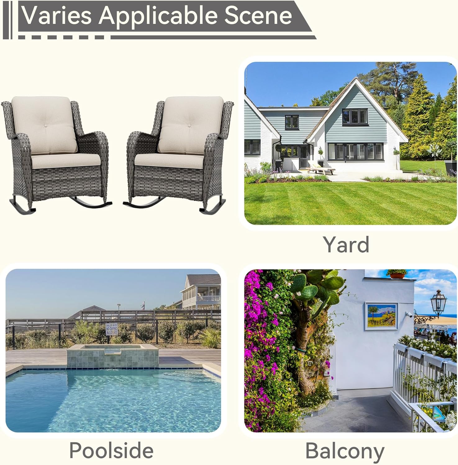 Outdoor Rocking Chair of 2, Wicker Patio Rocker Chair for Yard, Porch, Mixed Brown Grey Rattan, Beige Cushions